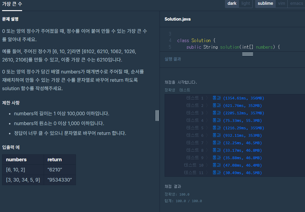 0 또는 양의 정수가 담긴 배열 numbers가 매개변수로 주어질 때, 순서를 재배치하여 만들 수 있는 가장 큰 수를 문자열로 바꾸어 return 하도록 solution 함수를 작성해주세요.