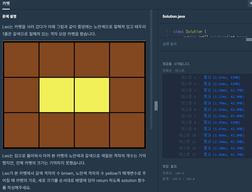 Leo가 본 카펫에서 갈색 격자의 수 brown, 노란색 격자의 수 yellow가 매개변수로 주어질 때 카펫의 가로, 세로 크기를 순서대로 배열에 담아 return 하도록 solution 함수를 작성해주세요.