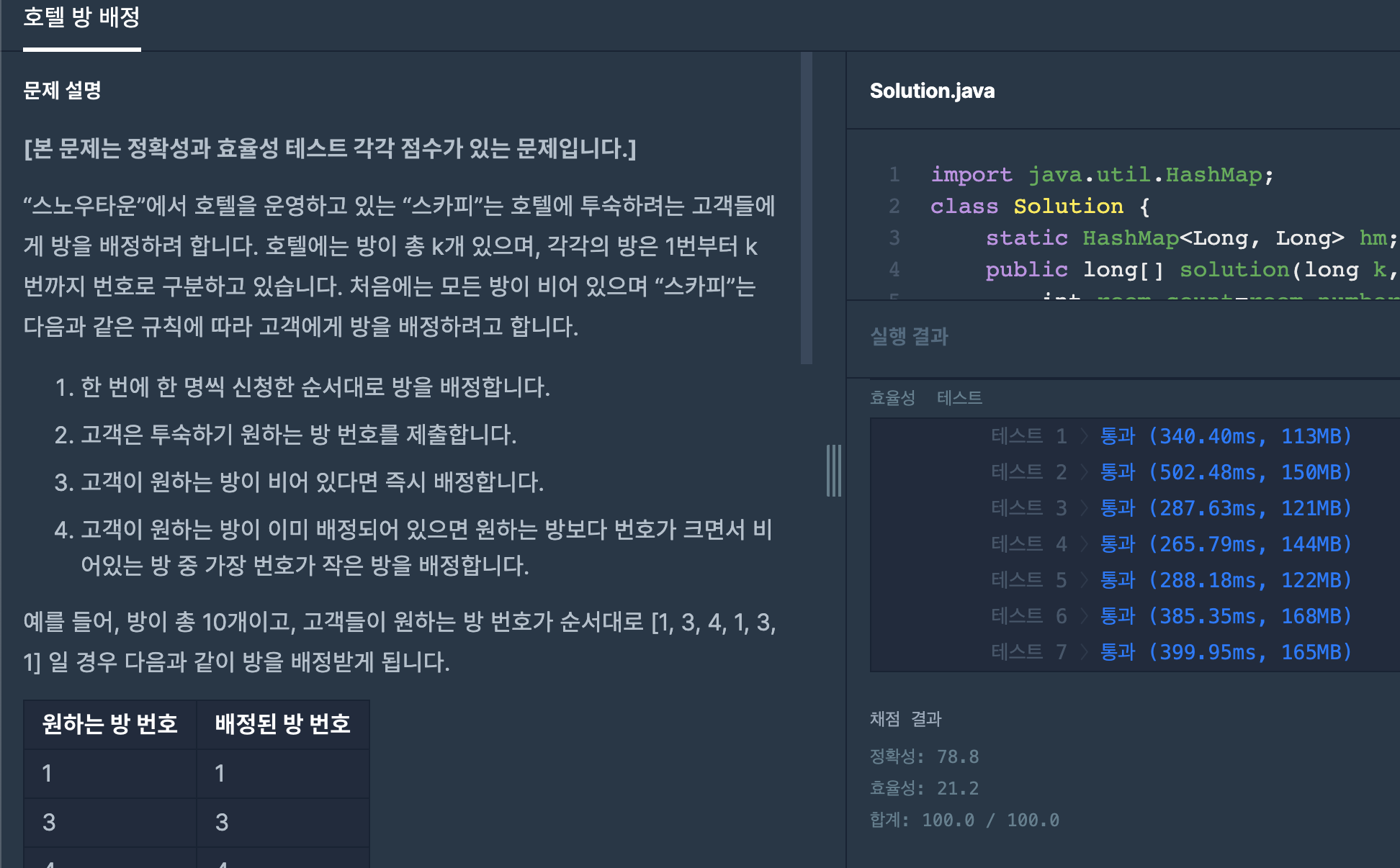 - 고객이 원하는 방이 이미 배정되어 있으면 원하는 방보다 번호가 크면서 비어있는 방 중 가장 번호가 작은 방을 배정합니다.