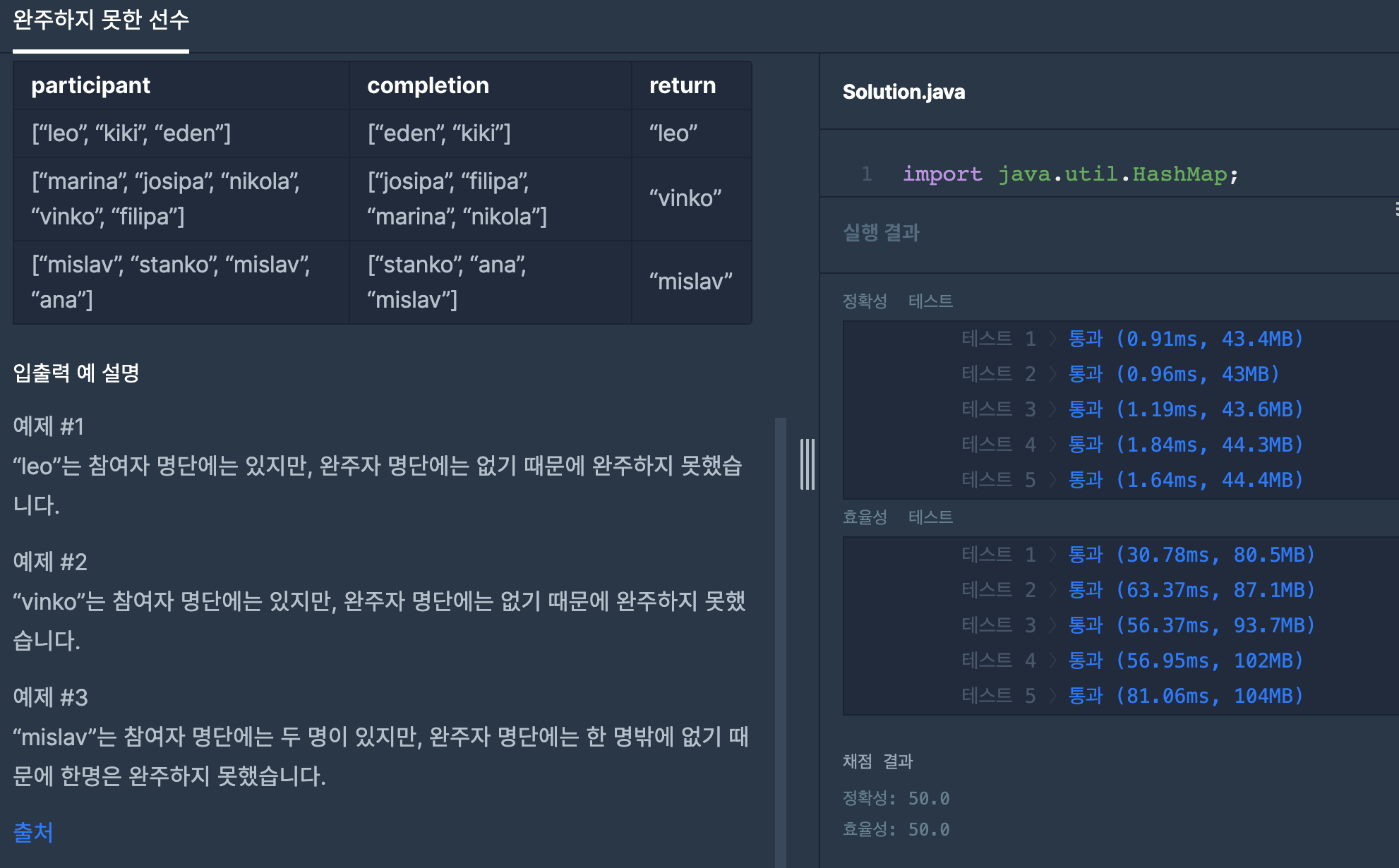 HashMap으로 완주자 명단을 등록 해준뒤 참가자명단의 수만큼 순휘하면서 완주자 명단에 없는자를 출력하였다.