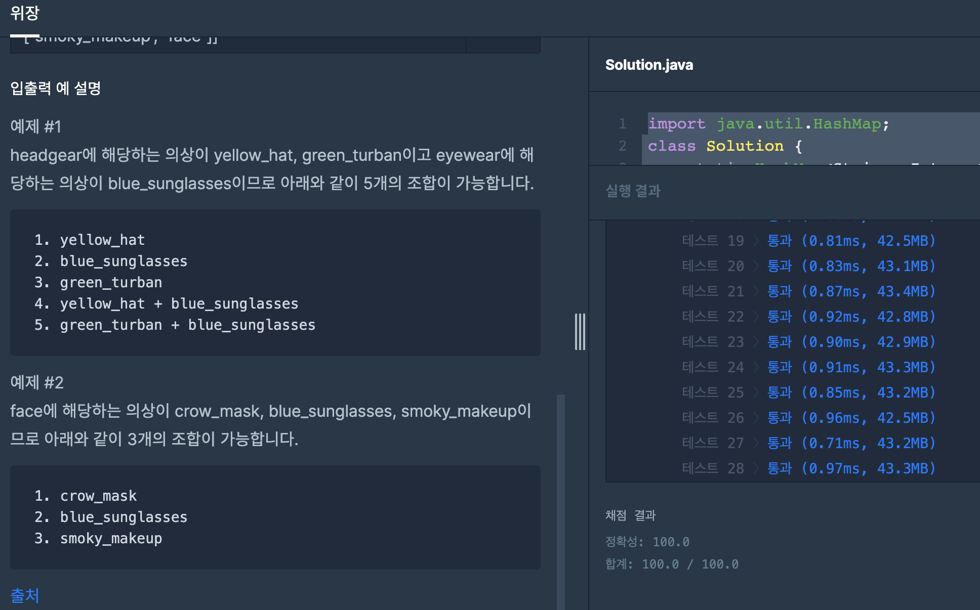 - 조합의 개수는 HashMap의 key값에 따른 Value값 + 1 해준 뒤 곱해주면 모든 조합의 수를 구할 수 있다.
