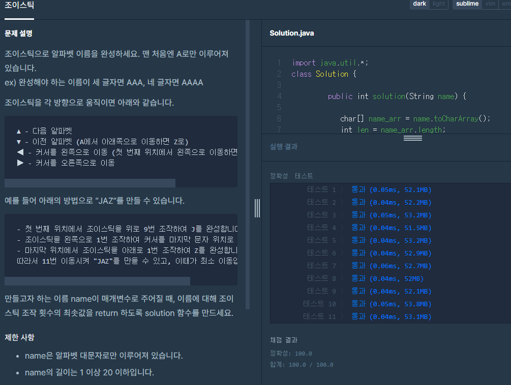 만들고자 하는 이름 name이 매개변수로 주어질 때, 이름에 대해 조이스틱 조작 횟수의 최솟값을 return 하도록 solution 함수를 만드세요.